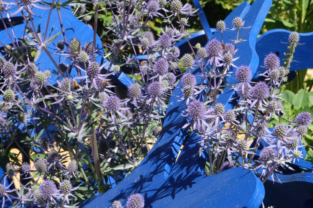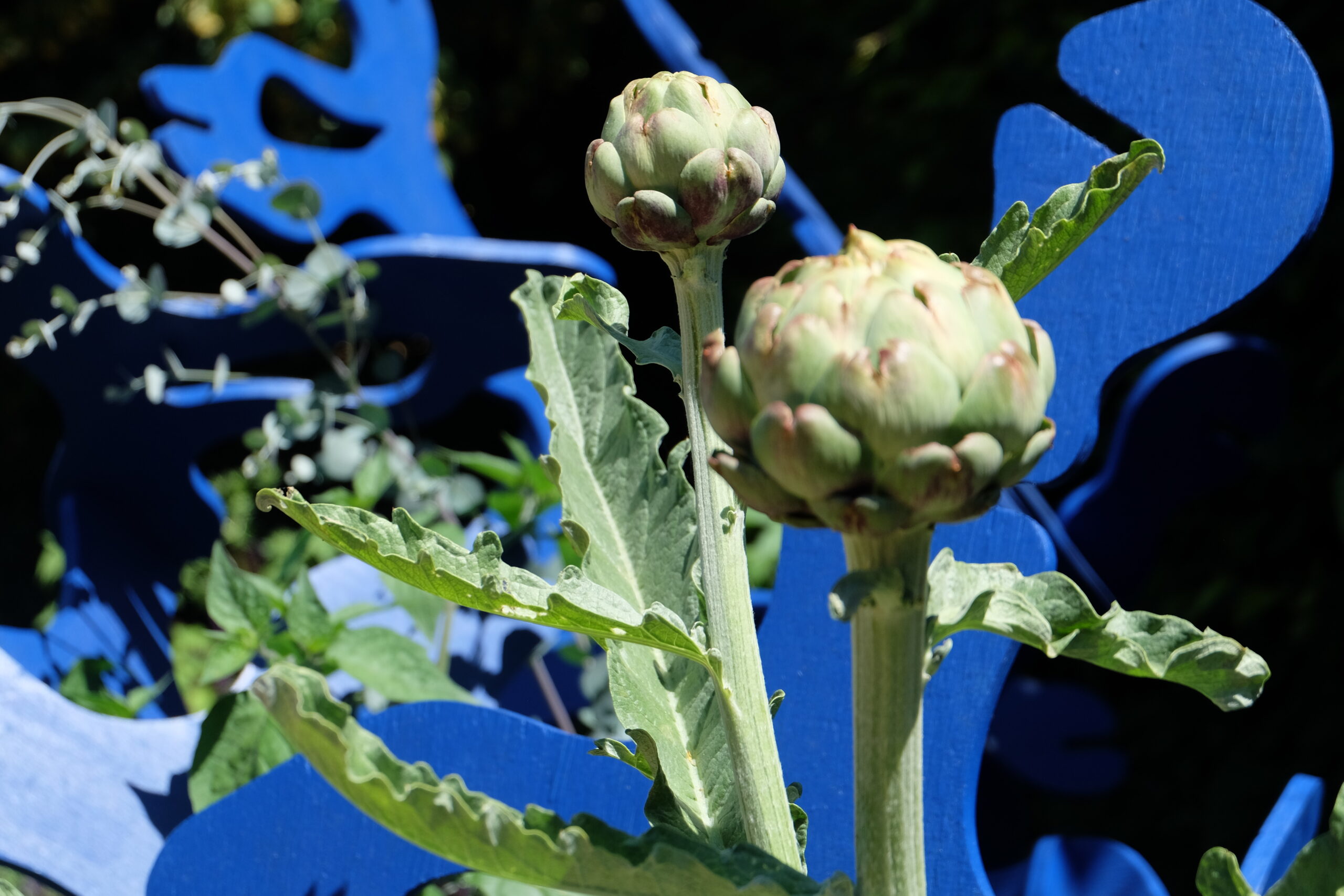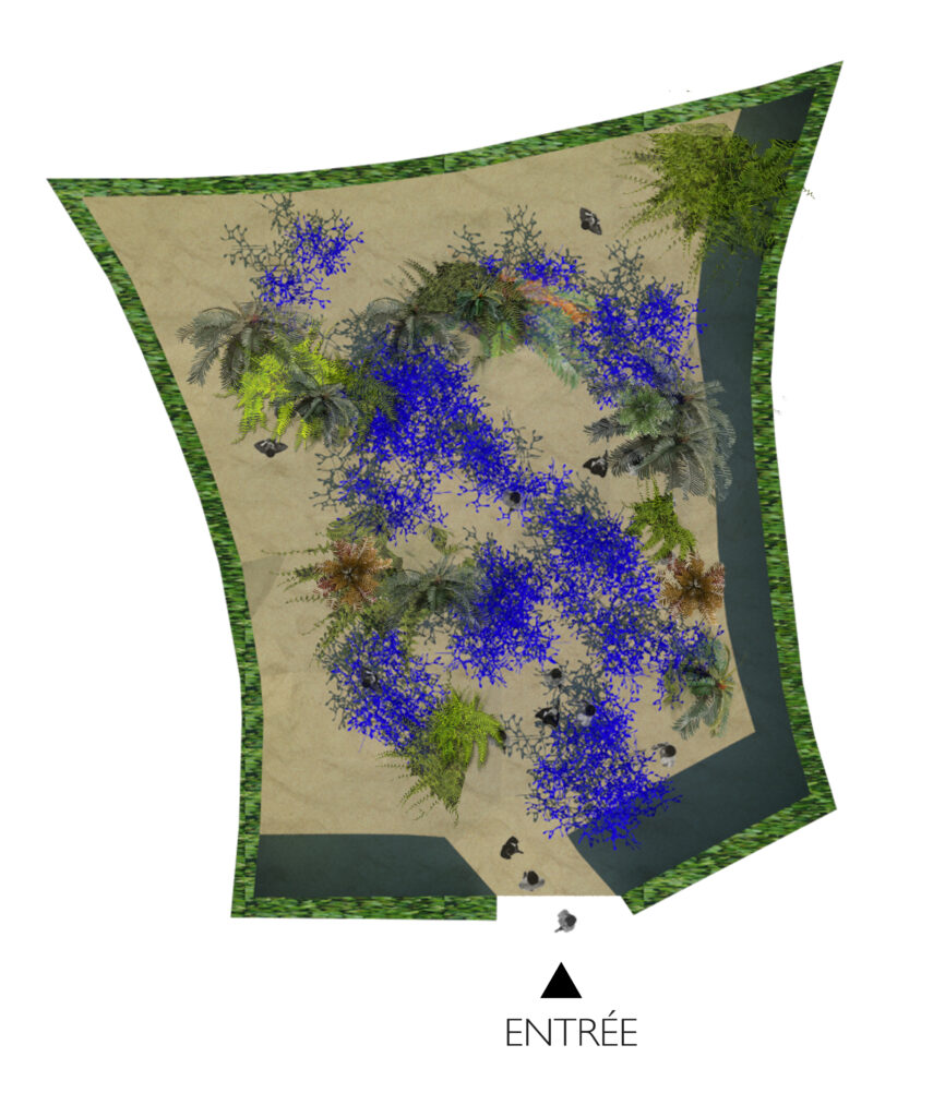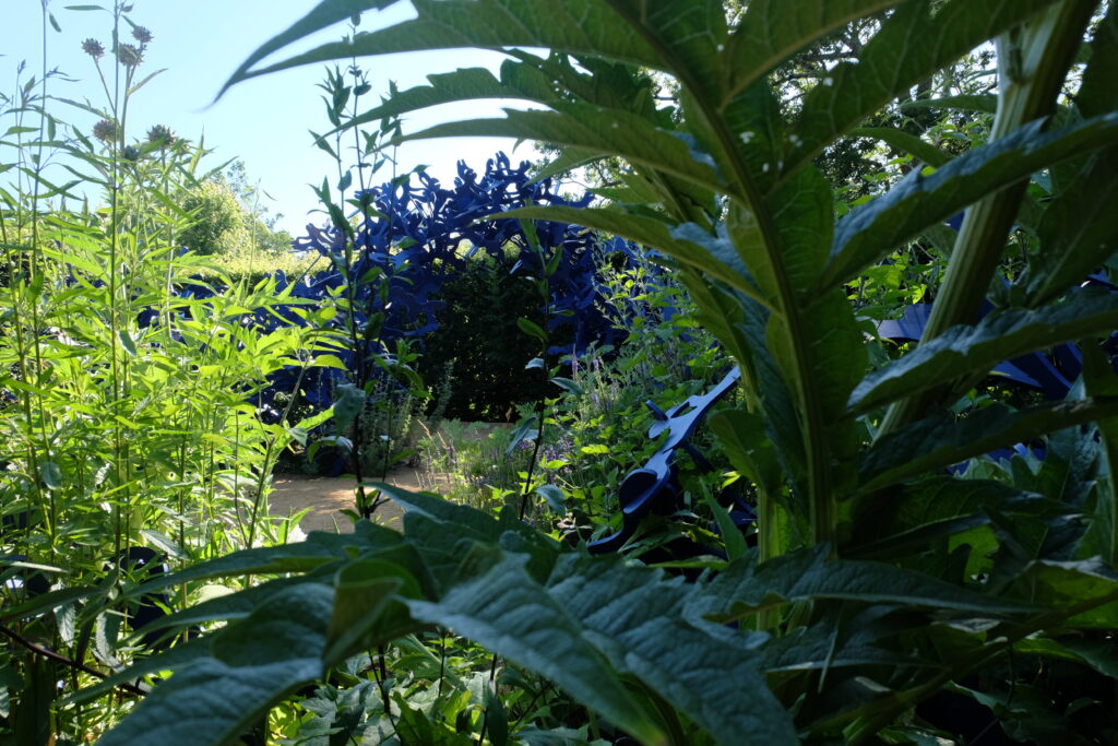 D’un bleu soutenu aux pieds des structures, on passe à des tons plus doux à mesure que l’on s’éloigne. Comme si le sable atténuait la couleur, à l’instar de l’oubli qui altère la pensée. Et par sa forme modulable et le choix des plantes qui le composent, le jardin imaginé ici est lui aussi l’écrin d’un savoir infini, sans cesse nourri, enrichi et croissant : des espèces mellifères qui attireront la faune de leur nectar (lavandes, sauges, aulx, centaurées, adénophores…), des espèces comestibles (artichauts, choux, poireaux…) et des plantes grimpantes (ipomées, passiflores…)
