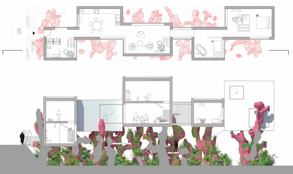 En interrogeant le rapport de l’artificiel au naturel et en utilisant la rémanence d’une architecture biomimétique, nous acceptons et anticipons le risque inondation. Faire l’expérience d’un nouveau mode d’habiter, inviter à interagir avec le lieu et les personnes qui le parcourent, telles sont les intentions du projet.
