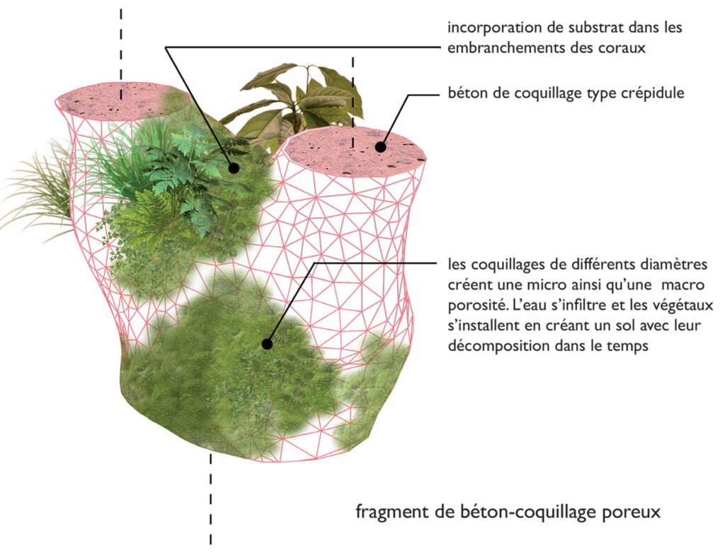 La porosité du matériaux « béton Crépidule » permet à l’eau de s’infiltrer dans la structure et de grimper par capillarité à travers l’architecture. Ce phénomène créé alors un gradient d’humidité progressif, du très humide au sol vers le plus sec au sommet. Ceci permet alors à une végétation variée de s’installer et d’évoluer de manière autonome, créant une structure vivante.