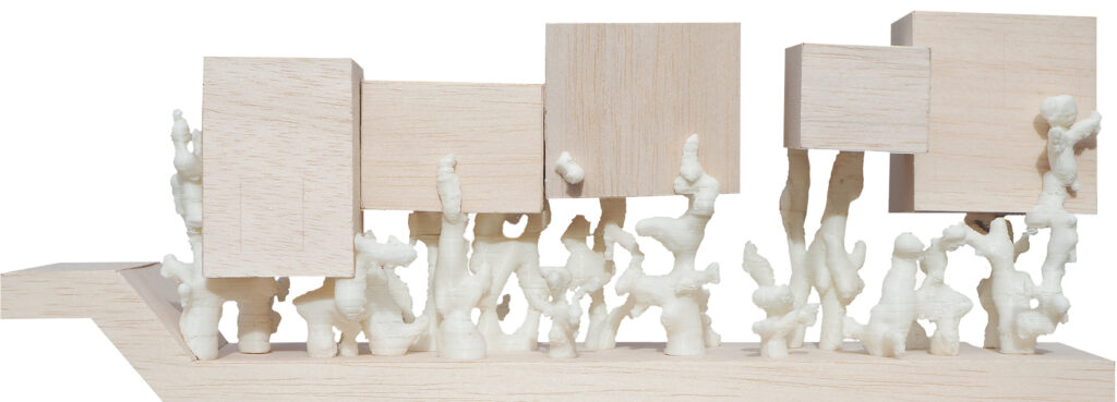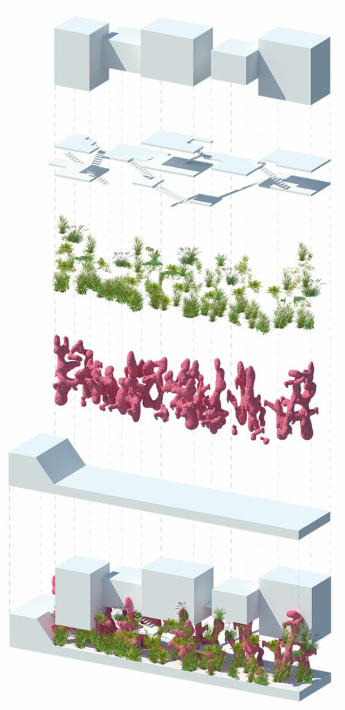 Une structure de corail hybride en constante évolution se transforme en végétation luxuriante. On se promène dans cet archipel qui propose un nouvel usage, celui de s’y arrêter à l’abri du tumulte de la ville, dans un moment de rêverie et de contemplation.