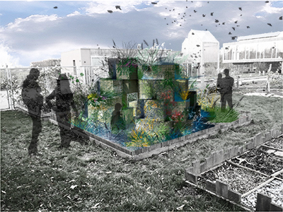 Ce jardin potager met en scène les légumineuses qui sont principalement implantées sur le dernier niveau. De part leur nature, elles améliorent spontanément les qualités du sol ici de haut en bas. Le jardin s’agence de manière systémique, mais peut aussi être divisé et remanié dans l’ensemble du parc pour créer par exemple une série de mobiliers.