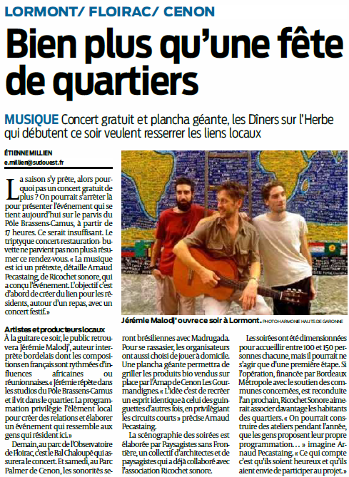 Les Dîners sur l’herbe, Été métropolitain avec Ricochet Sonore et l’AMAP Gourmandignes – Sud Ouest – 2018